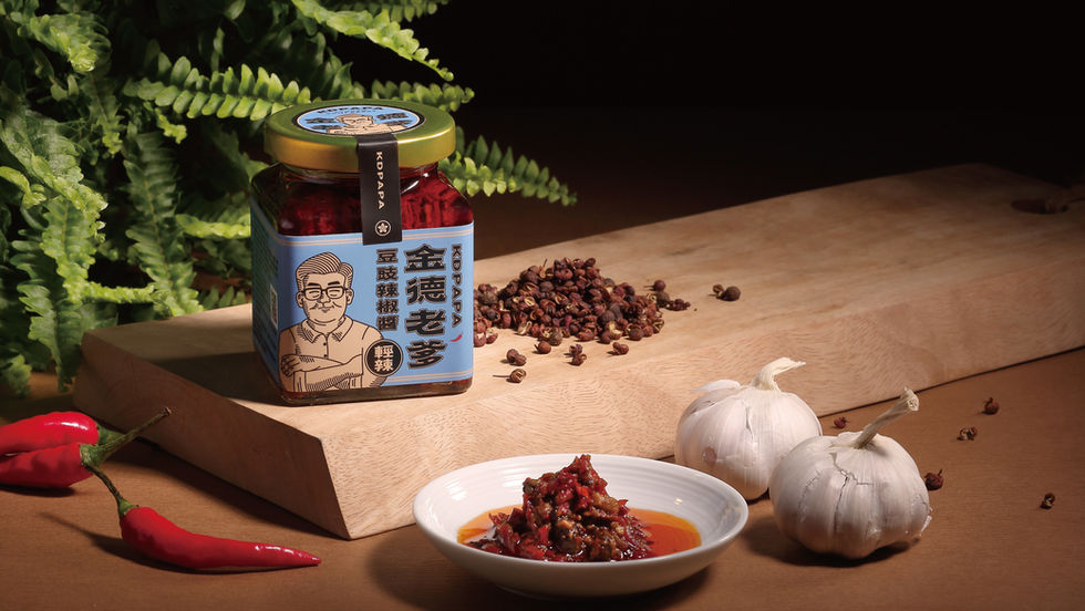 整體設計不僅讓人聯想到傳統家族製作的醇厚風味,也帶出現代台式品牌的獨特魅力。 顏色運用方面,商標以紅色與金色為主,紅色象徵熱情、經典與濃郁的風味,與辣椒醬的產品特性相呼應;金色則代表品質、傳承與高級感,增添品牌的價值感與識別度。這兩種色彩的結合,不僅傳遞出品牌的溫暖與故事感,更讓整體視覺充滿台灣傳統市場的氛圍,充滿生命力與親和力。