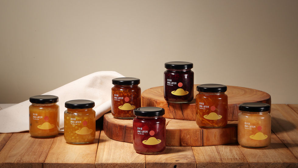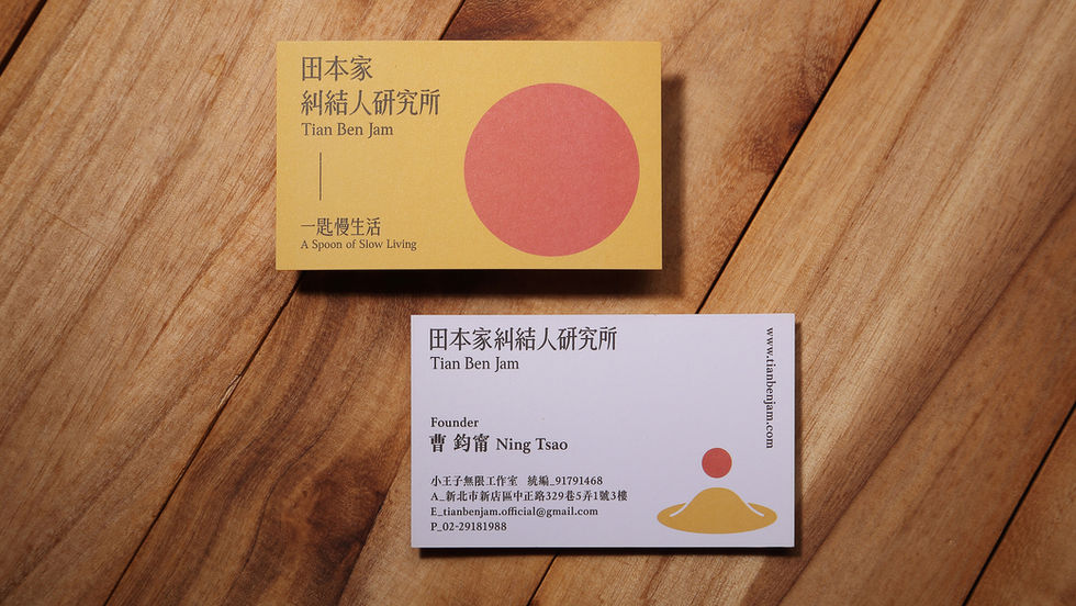 品牌識別以極簡造形為基礎,將果醬的觸感、土地的形象與人的存在整合於單一視覺符號中。下方圓潤曲線取自果醬抹開後的自然形態,傳達手工製作的柔軟質地,同時可被解讀為土地的山形輪廓,象徵產地與穩定基礎。上方圓形作為視覺錨點,與主體構成抽象的人與斗笠形象,以低重心、靜態且平衡的比例,呈現安定與緩慢的節奏。